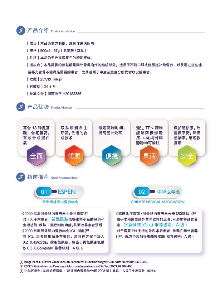 【適 應(yīng) 癥】本品提供的氨基酸是腸外營(yíng)養(yǎng)治療的組成部分,適用于不能口服或經(jīng)腸道補(bǔ)給營(yíng)養(yǎng),以及通過(guò)這些途徑補(bǔ)充營(yíng)養(yǎng)不能滿(mǎn)足需求的患者,尤其適用于中度至重度分解代謝狀況的患者。